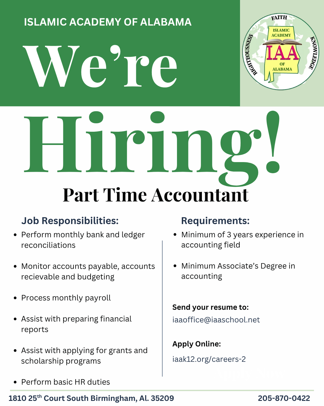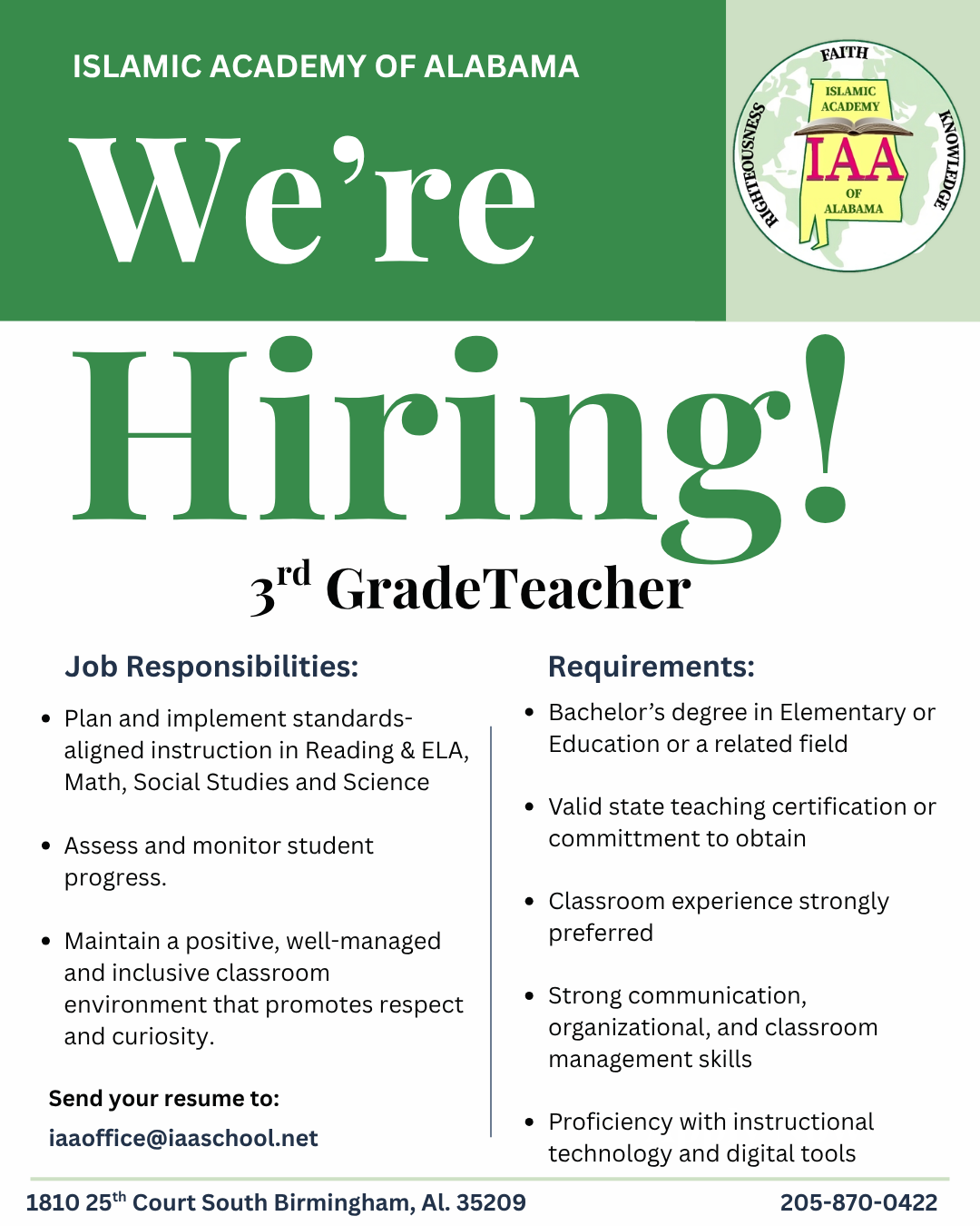 Are you passionate about education and have the talents to teach children at the elementary level? Do you possess high-level interpersonal and presentation skills? Are you a detail and result-oriented professional who loves to see children excel in school? Do you enjoy working with a diverse student body with cultures from around the world in a small and intimate classroom setting? If you answered yes to the above questions, we at the Islamic Academy of Alabama would love to hear from you.